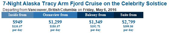 Celebrity Cruises ~ Celebrity Solstice Cruise To Alaska Get 2 Free Perks & Save Up To $1,350! Departing Vancouver on May 6, 2016.
