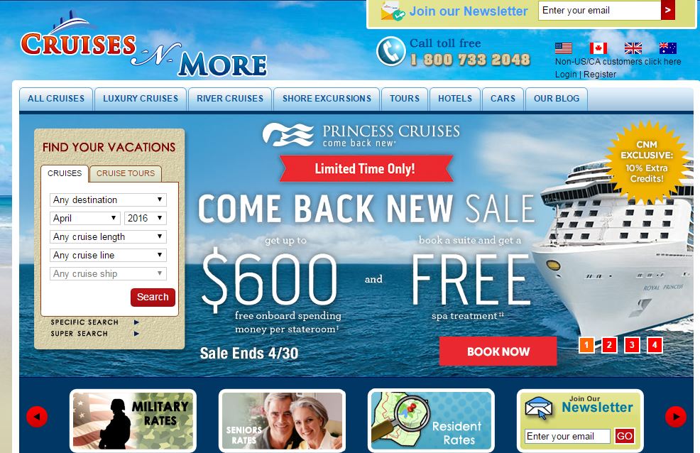 Please contact us for details at 800-733-2048 (toll-free USA/Canada) or +1-407-771-4454 or email us at service@cruises-n-more.com.