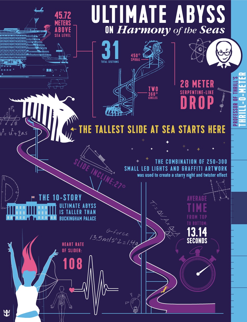 Royal Caribbean International’s Harmony of the Seas, the world’s largest cruise ship, claims another record as home to the tallest slide and most exhilarating adventure at sea: Ultimate Abyss. The hair-raising, 10-story slide is “possibly the most thrilling manmade adventure at sea,” according to thrill engineer Professor Brendan Walker, Thrill Laboratory, U.K., director. Enlisted to identify the level of “thrill,” a sudden feeling of excitement and pleasure, triggered by the Ultimate Abyss, Walker measured physical reactions of testers brave enough to accept the challenge. Walker also compared the latest innovation by the global cruise line known for many firsts-at-sea to other Royal Caribbean signatures, the FlowRider surf simulator and RockWall, to compare the varying levels of thrill available onboard Harmony of the Seas. Ultimate Abyss scored a Walker Thrill Factor of 45.35 percent as compared to the FlowRider (36.15 percent) and RockWall (34.59 percent). Considering it is highly unlikely that a single experience could be designed to score a Walker Thrill Factor of 100 percent, these scores are understood to be at the high end of thrill attractions; therefore, making Harmony the ultimate cruise ship for adrenaline junkies.