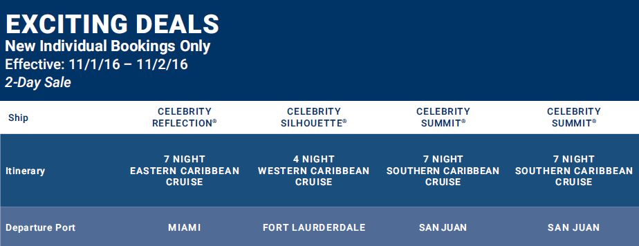Celebrity Cruises EXCITING DEALS New Individual Bookings Only Effective: 11/1/16 – 11/2/16 2-Day Sale