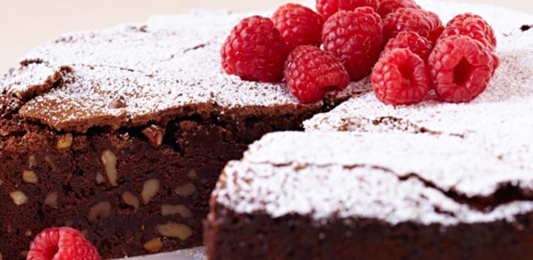 This dense moist cake is like a giant chocolate truffle – crunchy on top with a deliciously fudgy center. This extremely rich treat is so simple to make that it’s popular all year round. And you can serve it to your gluten-free friends without any apologies. You can make it in advance, then take it out of the refrigerator an hour or two before serving because it tastes even better the day after you make it.
