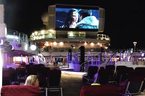 The Vista Lounge on Deck 7 aft also shows movies. The lounge is large and comfortable with tables for drinks and a big screen to enjoy all the action. Unlike Movies Under the Stars, the Vista Lounge lights can be dimmed for better movie viewing.