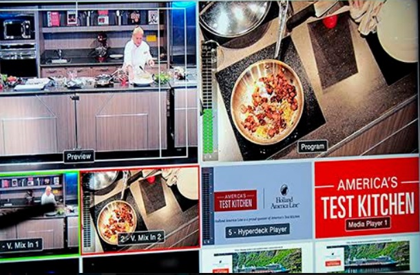 A control room screen monitors the demonstrations of creative cooking with innovative ingredients by certified chefs brought on board from the popular TV program America’s Test Kitchen. The demonstrations are specifically created for Holland America Line and the recipes are designed to be foolproof for the home cook.