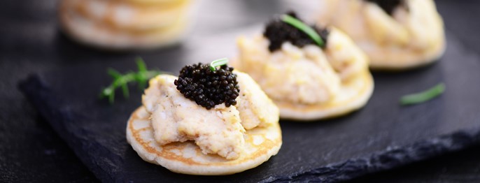 Serve with caviar or smoked salmon, garnished with chopped hard-boiled eggs, minced onion, crème fraîche and dill.