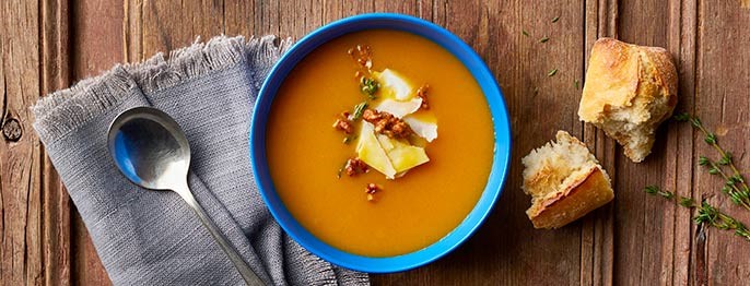 The sugar pumpkin called for in this recipe is a cooking variety; dense with meat, tender and perfect for cooking and baking, it is an excellent source of vitamin A. When you purée the soup, remove the center cap from the lid, covering the hole with a towel to allow steam to escape—this prevents the lid from popping off.