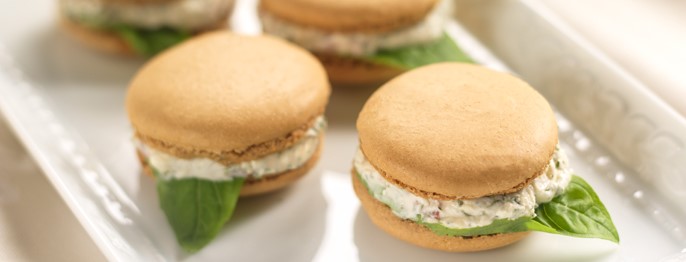 Surprise your friends with this savory macaron, a twist on the traditionally sweet cookie with its mild crust and tangy center of feta, fresh tomatoes, and basil. When you assemble them, be sure to spread the filling gently or even use a piping bag to prevent damaging the delicate meringue cookies.