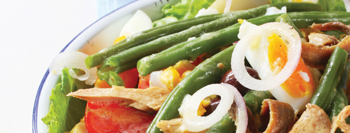 This salad’s name, pronounced “sah LAHD nee SWAHZ,” reflects its origin of Nice, France. The ingredients—particularly tomatoes, capers and olives—also harken back to the flavors of sunny Provence. Enjoy this hearty salad, substantial enough by itself for a lunch or light dinner, with a glass of chilled white wine and a crusty French epi or baguette.