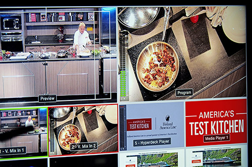 A control room screen monitors the demonstrations of creative cooking with innovative ingredients by certified chefs brought on board from the popular TV program America’s Test Kitchen. The demonstrations are specifically created for Holland America Line and the recipes are designed to be foolproof for the home cook.