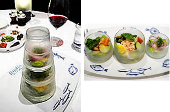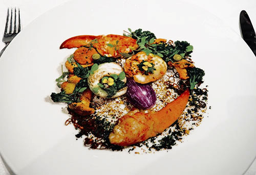 The Pinnacle Grill on the Zuiderdam lacks some of the sophistication of its namesake on the Eurodam. There are no Dutch masters paintings on the walls. The room is bright with an understated elegance, however, and retains some of its original antique statuary while being modernly upscale. The star of the Pinnacle is the cuisine of celebrity Master Chef Rudi Sodamin. On a single evening during each cruise on all HAL ships Rudi’s Sel de Mer (literally “salt of the sea”) braisserie of seafood is featured. Limoges porcelain plates with Rudi’s own whimsical artistic designs inspired by the Cote D’Azur – the seafood painted on mine looked real enough to eat – and his unique appetizer, Rudi’s Seafood Tower – three stacked containers with octopus, shrimp cocktail, and crabmeat – were the stars of the show.