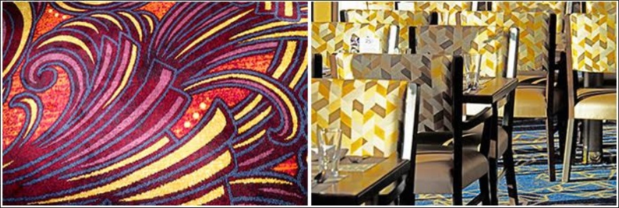 The list of renovations and refurbished areas of the ship is extensive. Graphically colorful carpeting, such as the sample above from the Mainstage theater, and seating, like the new chairs in the Lido Market above, are prominent. Less obvious are the 102 fully upgraded suites and new chairs and sofas in all staterooms. New signage and elevator boards, as well as 42” flat-screen television monitors in staterooms and 50” TV monitors in suites, have been added throughout the ship.