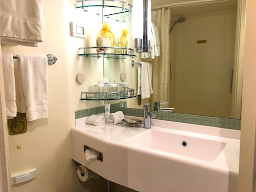 Complimentary white robes are available for use while on the cruise. If one isn’t in your cabin, just ask the room attendant for one. The bathroom was small but big enough for me with a vanity, commode and shower. Shelves above the vanity offer even more storage space.