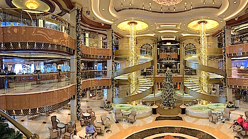 The heart of the ship is the glittering three-deck-tall atrium called the Piazza. That’s right – three ship decks for a glorious gathering spot.