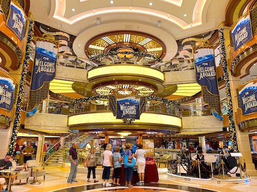 It’s always fun to step onto a new ship. The Regal Princess décor is lovely and subdued – warm woods, glistening marble, sparkling crystal, gleaming brass, bunches of windows, plenty of glass and light. The feeling is very open and airy.