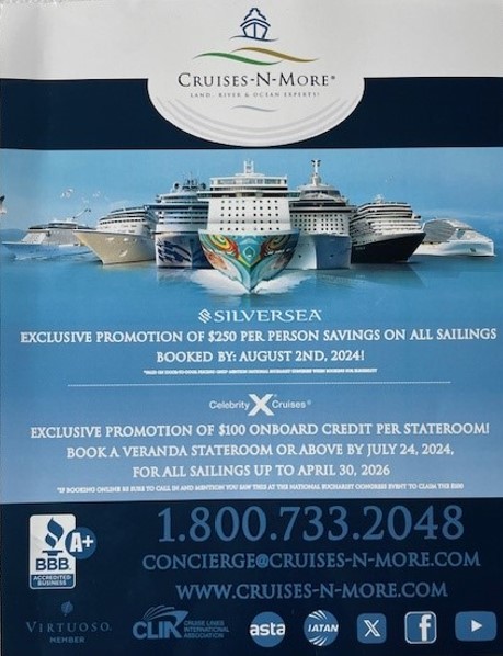 Sincere thanks for all their efforts and participation in this endeavor go to Cruises-N-More’s Tifni, Giovanna, and Jackie, as well as Silversea‘s John Wilson and Celebrity ’s Rebecca Thompson for their additional generous promotions.